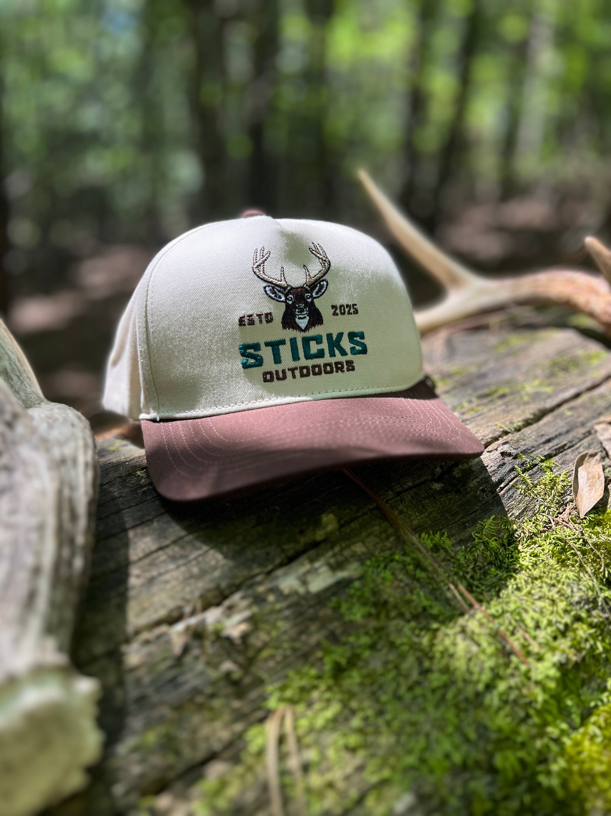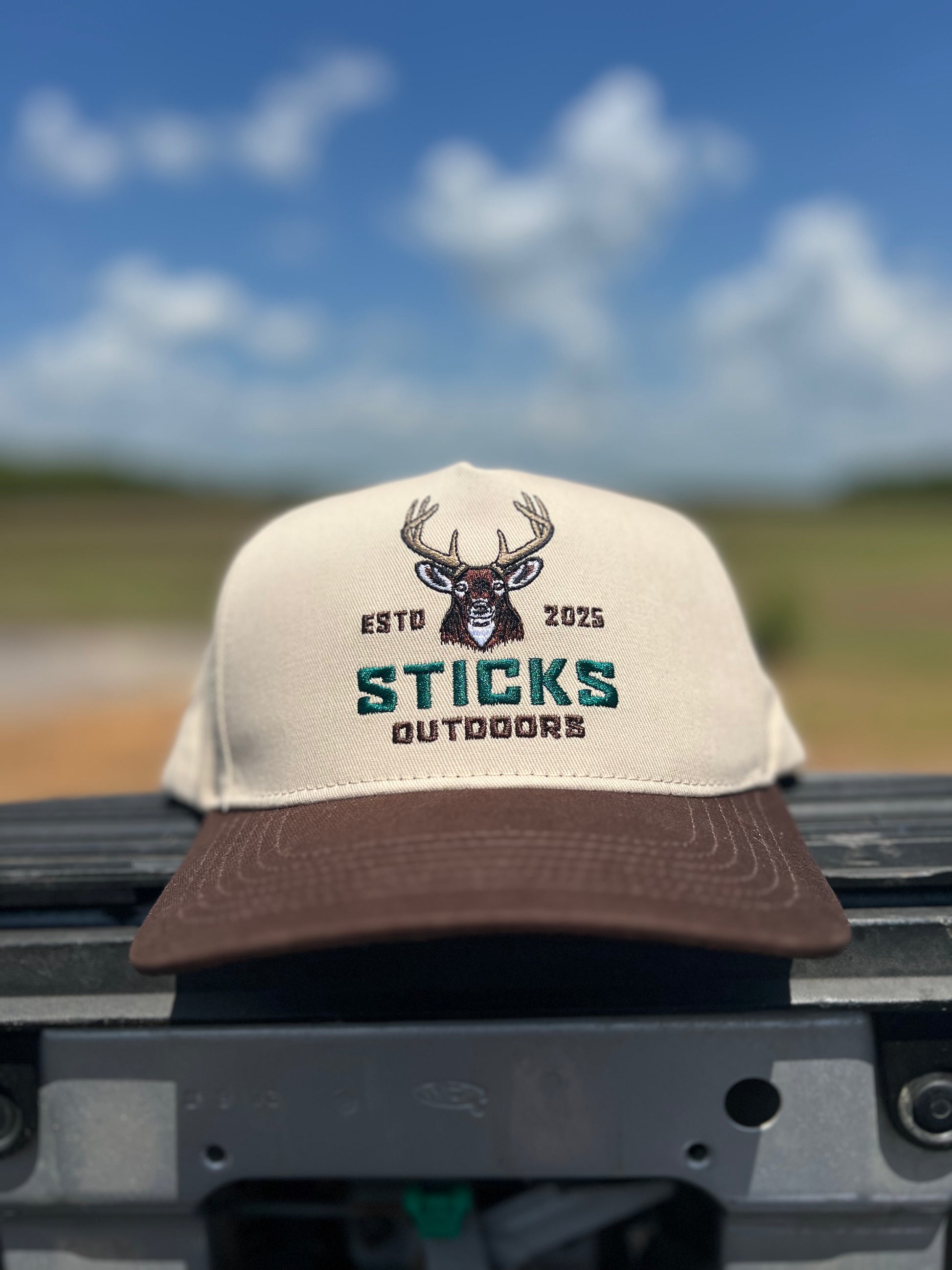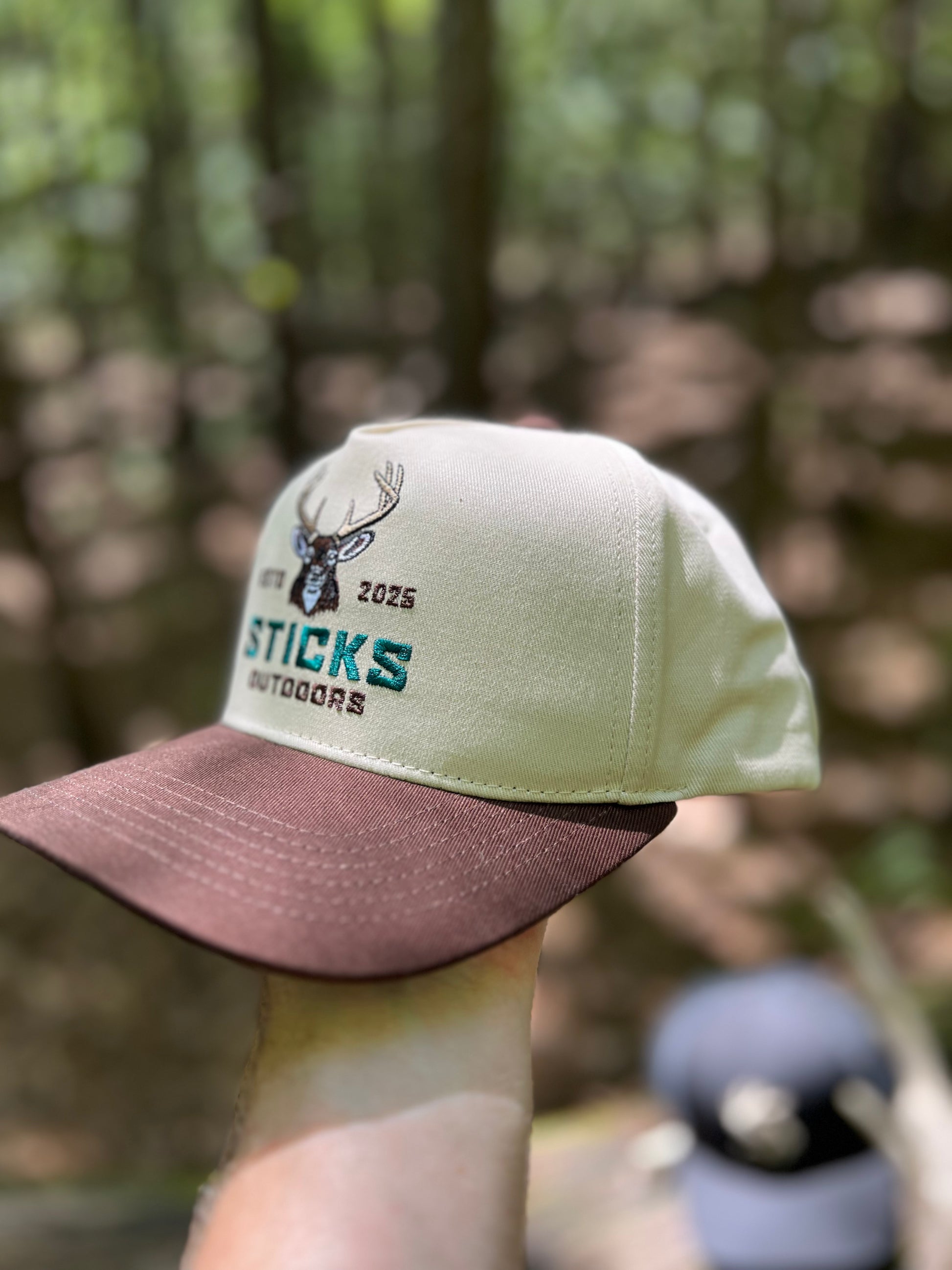 This 5-panel snapback combines a cream-colored top with a dark brown bill for a clean outdoor look. It features an embroidered deer logo on the front, highlighting a connection to deer hunting. The Sticks logo branding appears on the back band and inner sweatband, adding authenticity. Designed for durability and comfort, this hat is ideal for those who appreciate quality headwear with a connection to hunting and the outdoors.