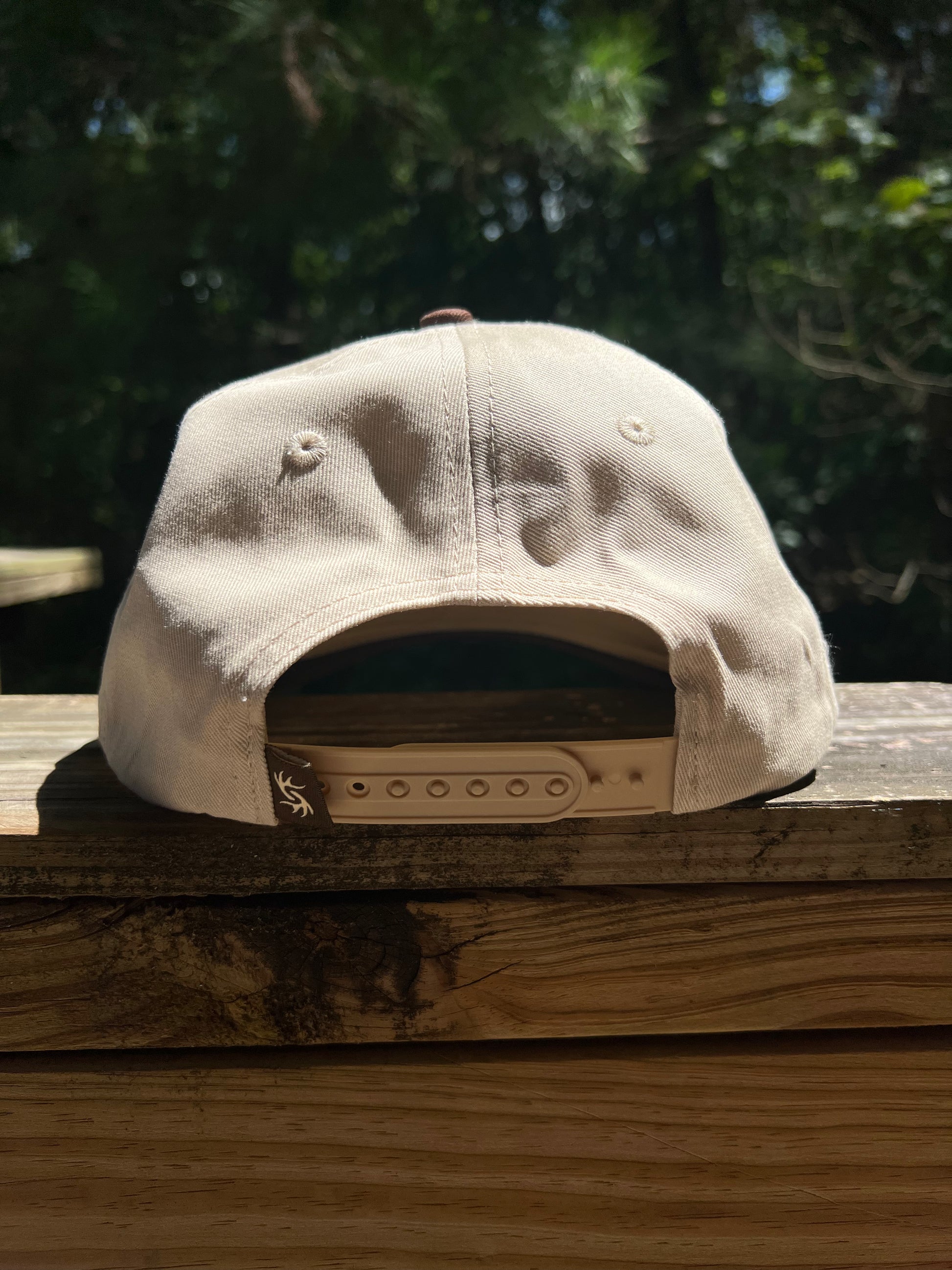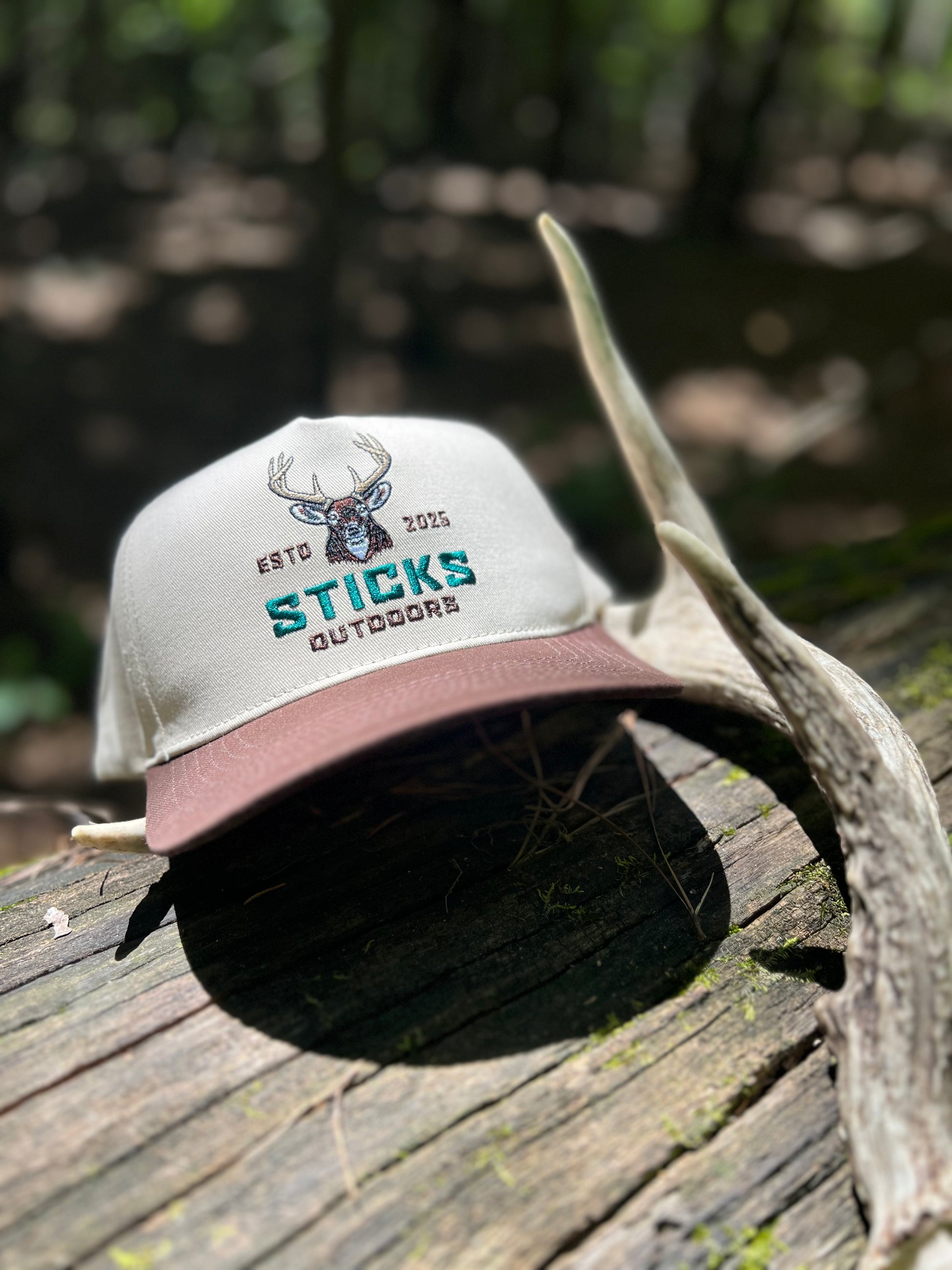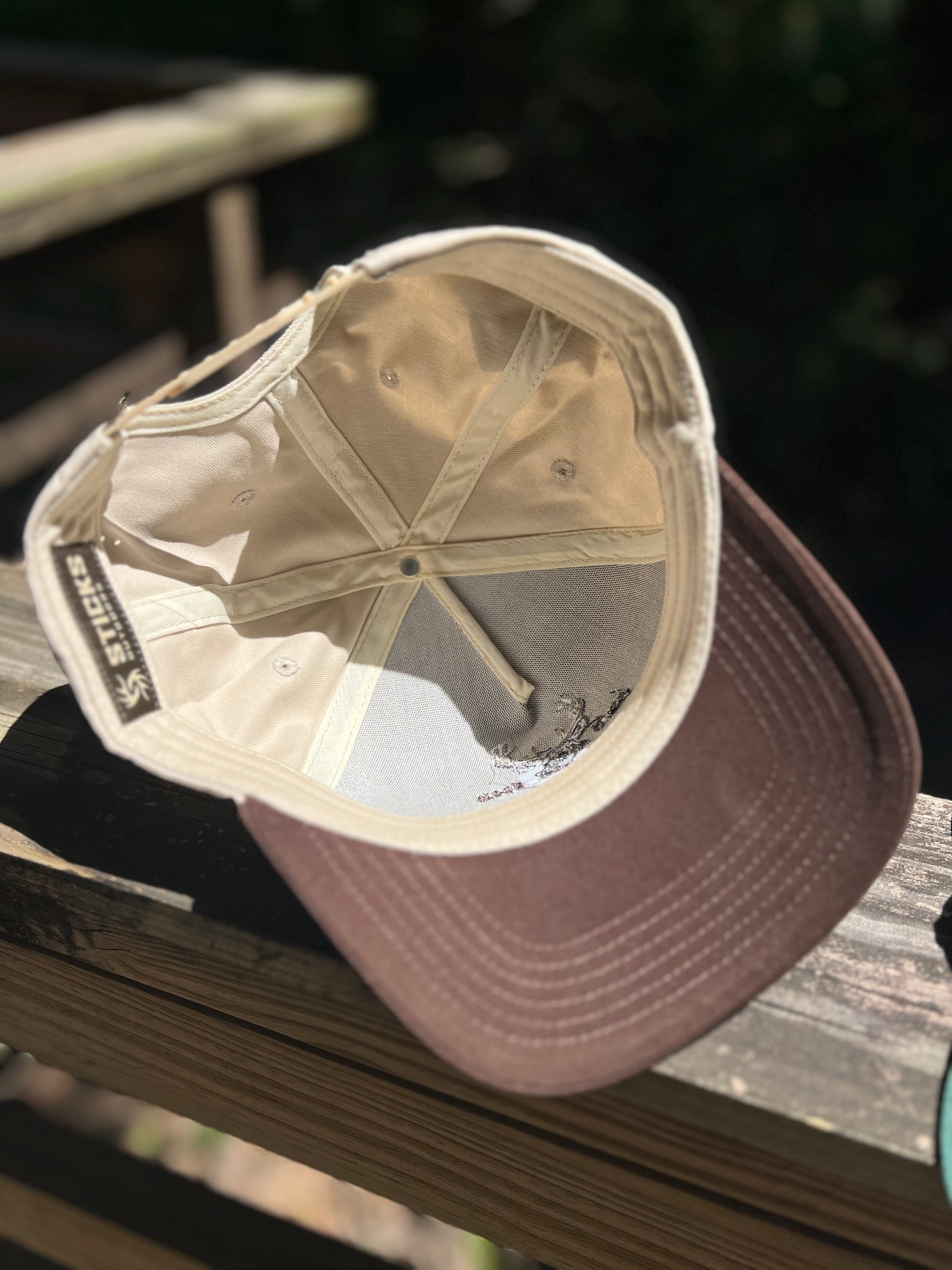 This 5-panel snapback combines a cream-colored top with a dark brown bill for a clean outdoor look. It features an embroidered deer logo on the front, highlighting a connection to deer hunting. The Sticks logo branding appears on the back band and inner sweatband, adding authenticity. Designed for durability and comfort, this hat is ideal for those who appreciate quality headwear with a connection to hunting and the outdoors.